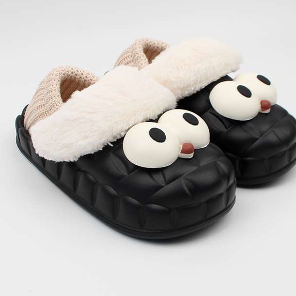 かわいい目玉デザインの室内用スリッパ。 ふわふわの内側とキルティング加工の外側が特徴的で、快適な履き心地を提供します。 寒い季節にぴったりの暖かいアイテムで、毎日のリラックスタイムをより楽しくするスリッパです。